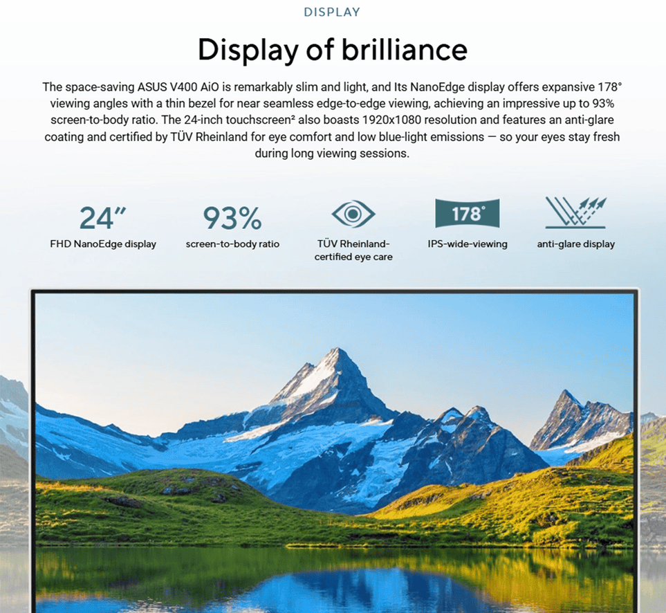 Non-touch screen, 23.8-inch, FHD (1920 x 1080) 16:9, LCD, 250nits, sRGB: 100%, 100Hz, Screen-to-body ratio 93%, Wide view, Anti-glare display