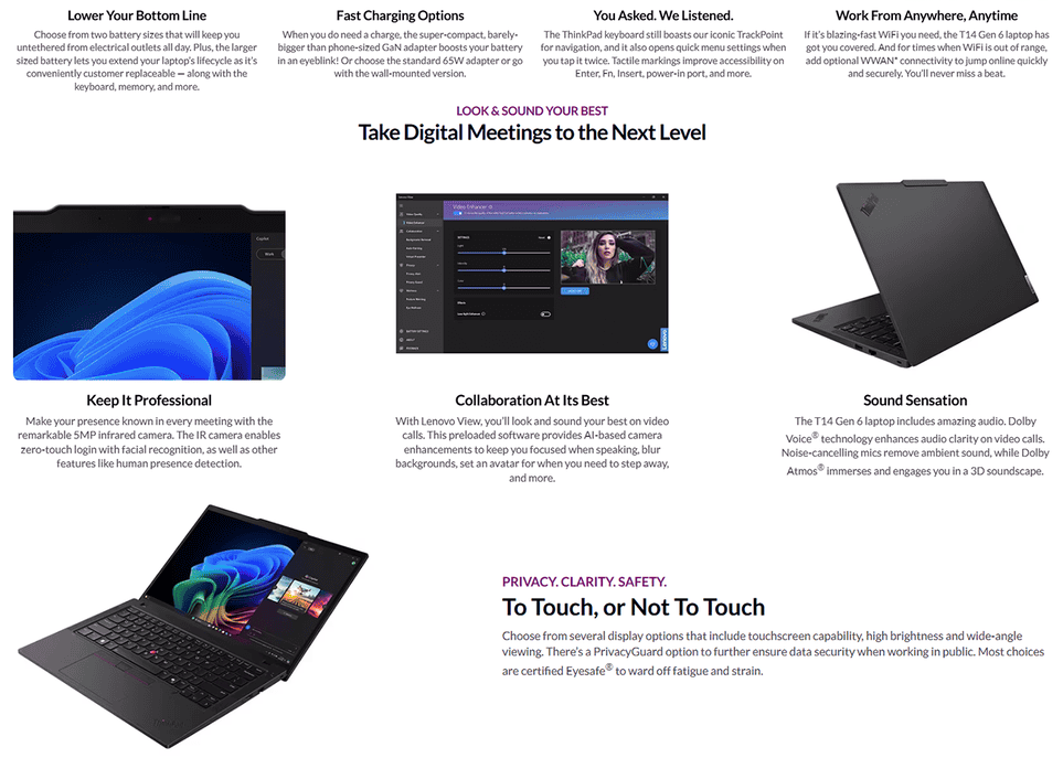 • Lenovo ThinkPad T14 Gen 6 21QC000LMA 14'' WUXGA Laptop Black ( CU5-225H, 16GB, 512GB SSD, Intel, W11P )4