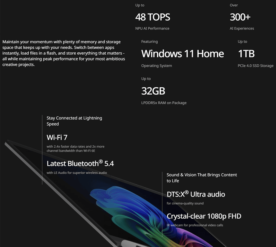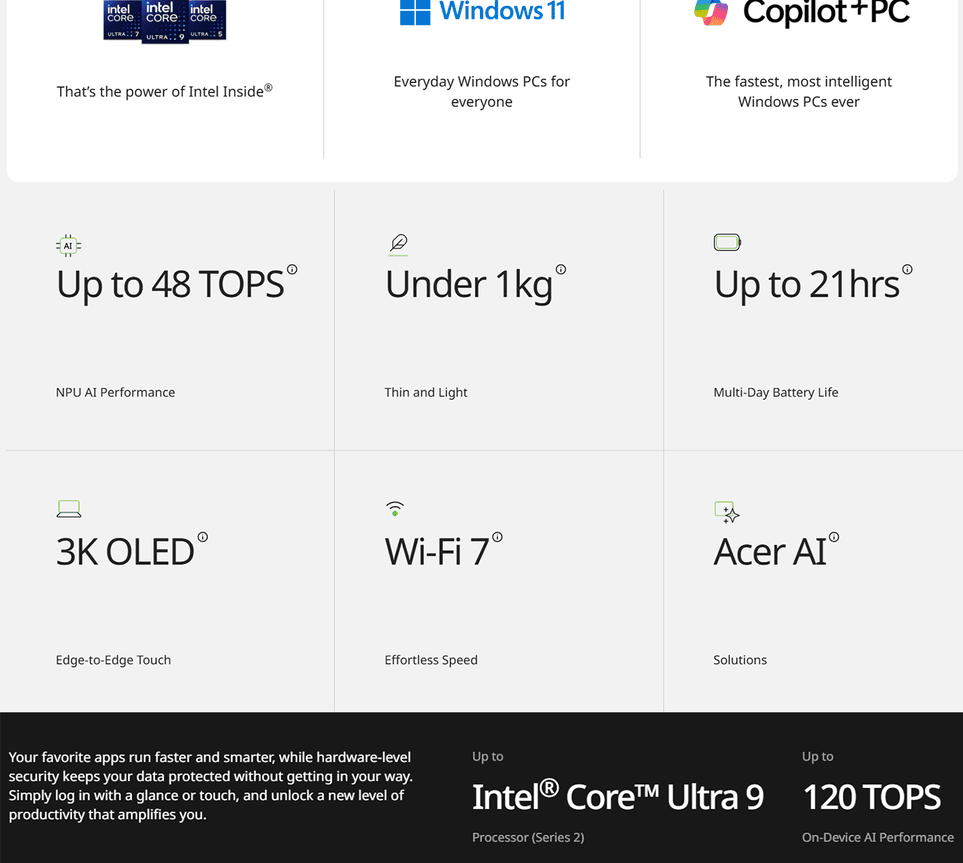14.0" display with OLED (Organic Light-Emitting Diode) technology, WQXGA+ 2880 x 1800, high-brightness (400 nits) Acer CineCrystal™ 16:10 aspect ratio, color gamut DCI-P3 100% with integrated multi-touch , Wide viewing angle up to 170 degrees