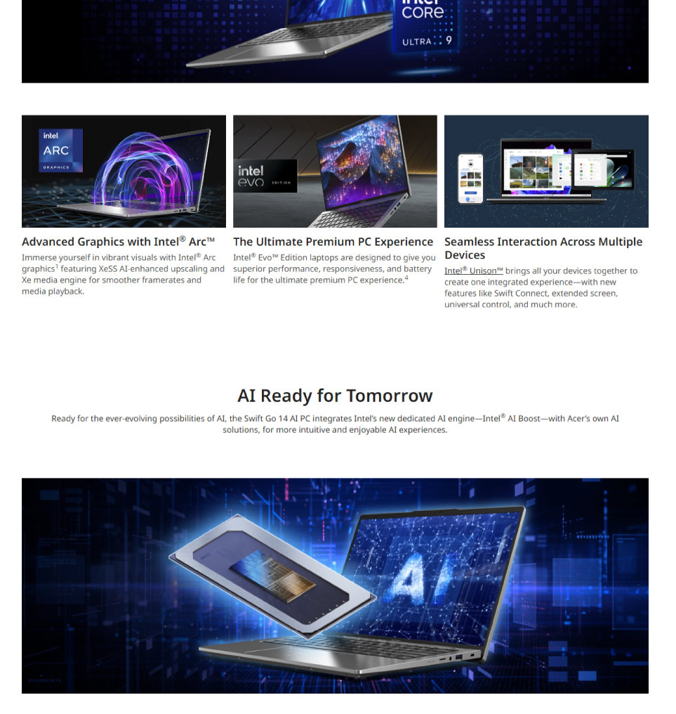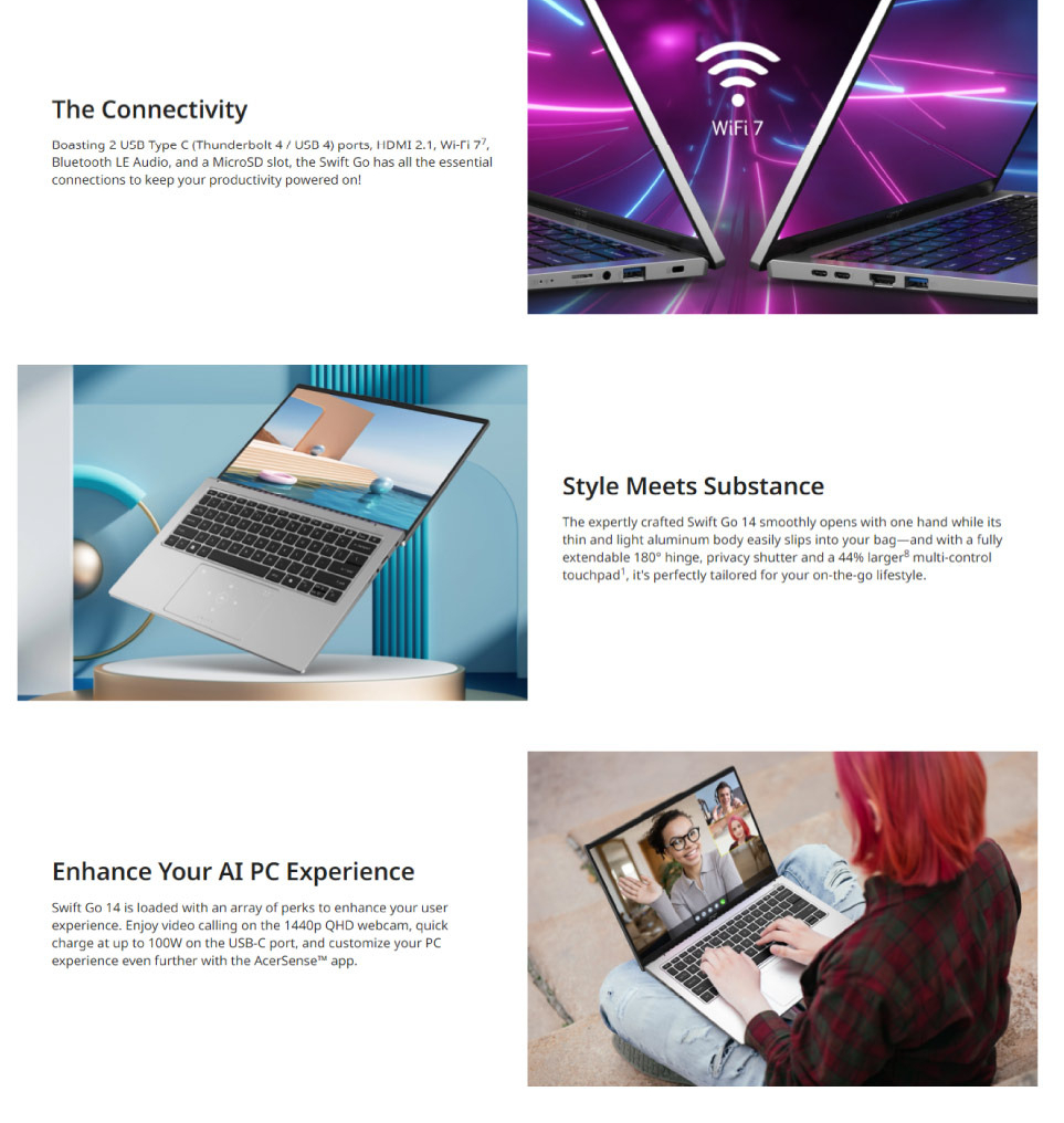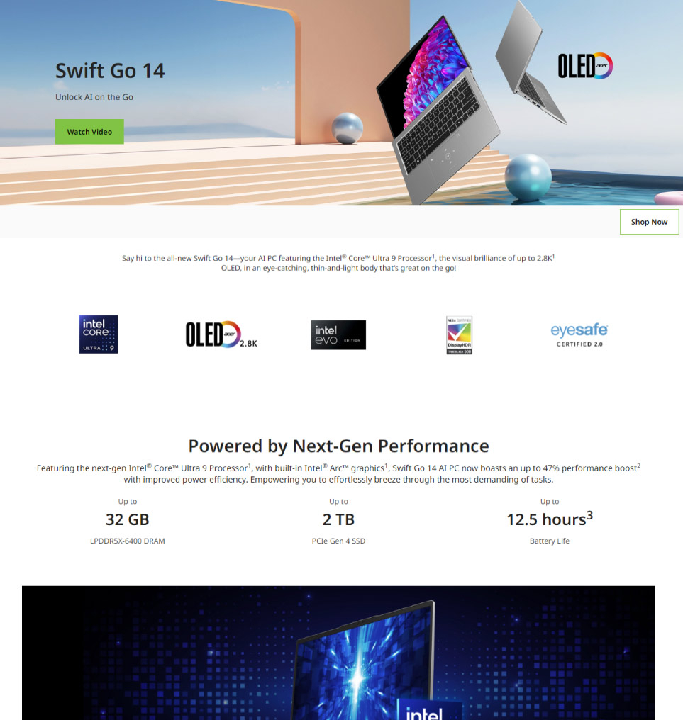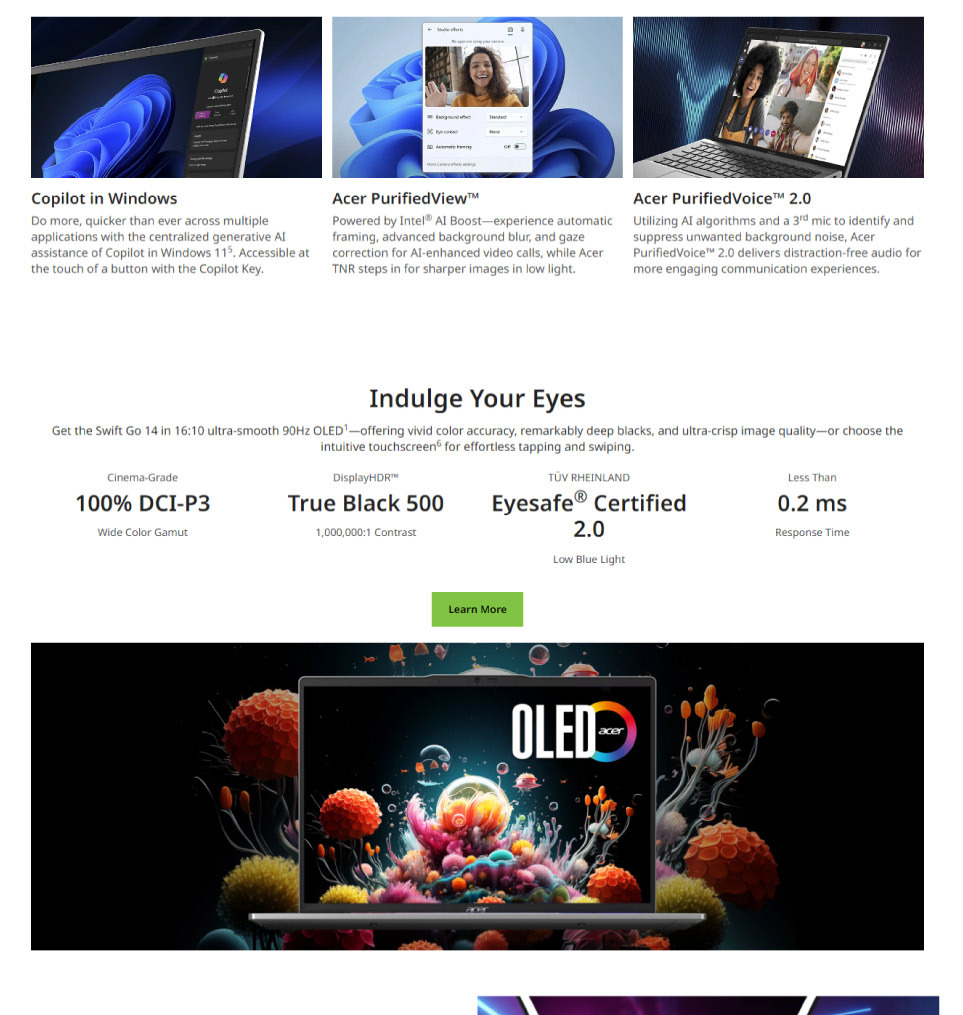 14.0" display with OLED (Organic Light-Emitting Diode) technology, WQXGA+ 2880 x 1800, high-brightness (400 nits) Acer CineCrystal™ 16:10 aspect ratio, color gamut DCI-P3 100%, certified by True Black HDR500, Mercury free, environment friendly