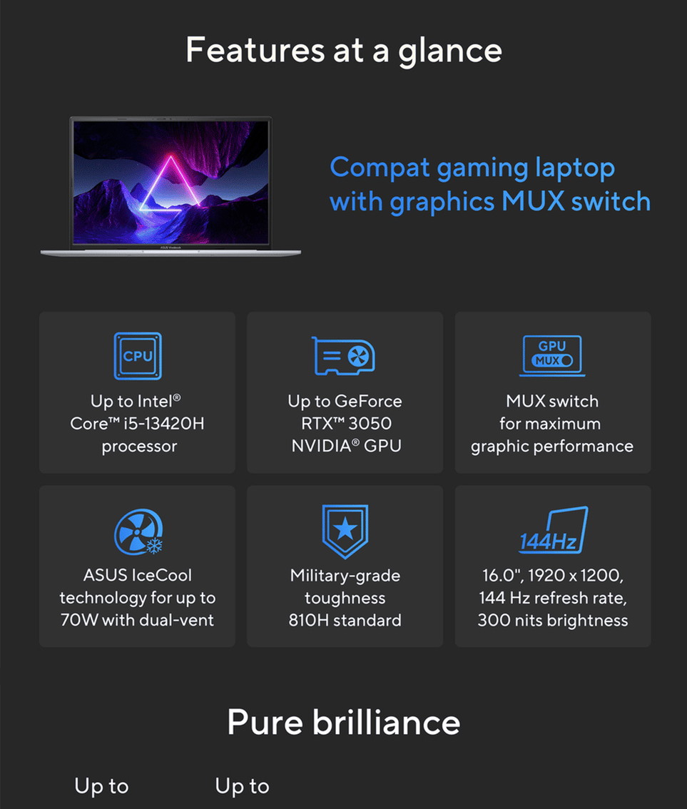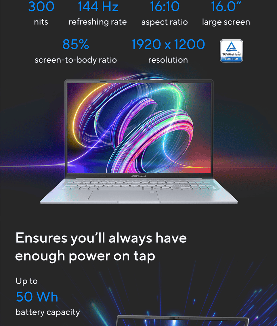 16" WUXGA (1920 x 1200) 16:10 aspect ratio LED Backlit/IPS-level Panel/144Hz refresh rate/300nits/45% NTSC color gamut/Anti-glare display, TÜV Rheinland-certified, (Screen-to-body ratio)86%, Non-touch screen
