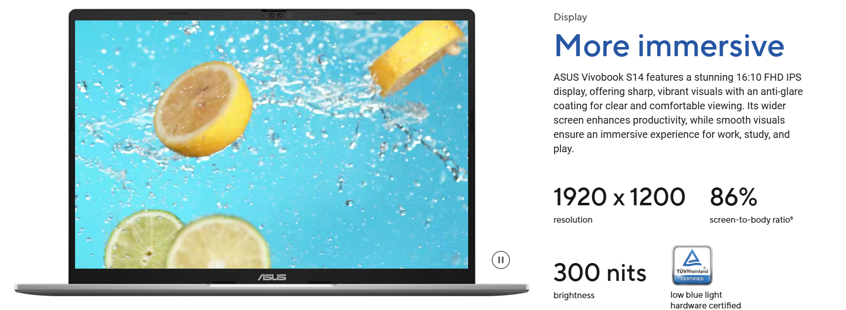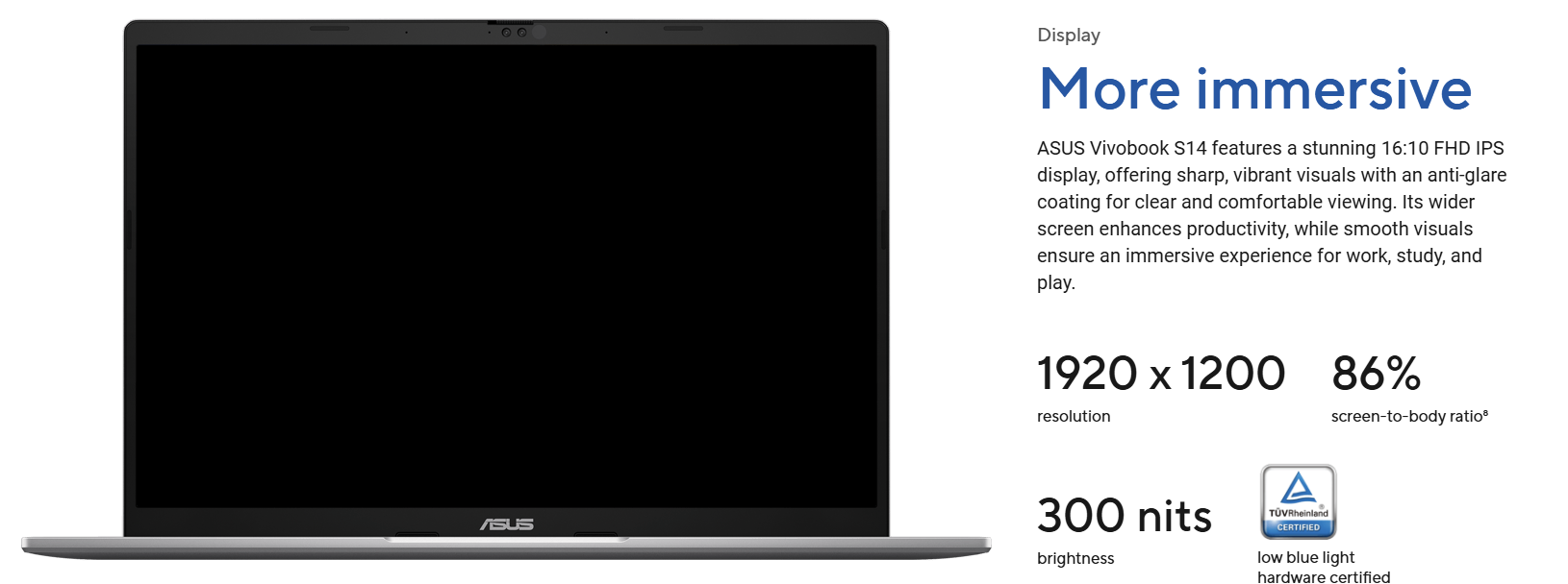 14.0-inch, WUXGA (1920 x 1200) 16:10 aspect ratio, IPS-level Panel, LED Backlit, 60Hz refresh rate, 300nits, 45% NTSC color gamut, Anti-glare display, TÜV Rheinland-certified, Non-touch screen, (Screen-to-body ratio)86%