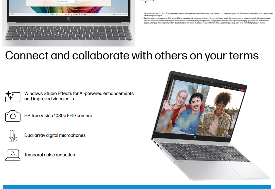 HP True Vision 1080p FHD camera with temporal noise reduction and integrated dual array digital microphones