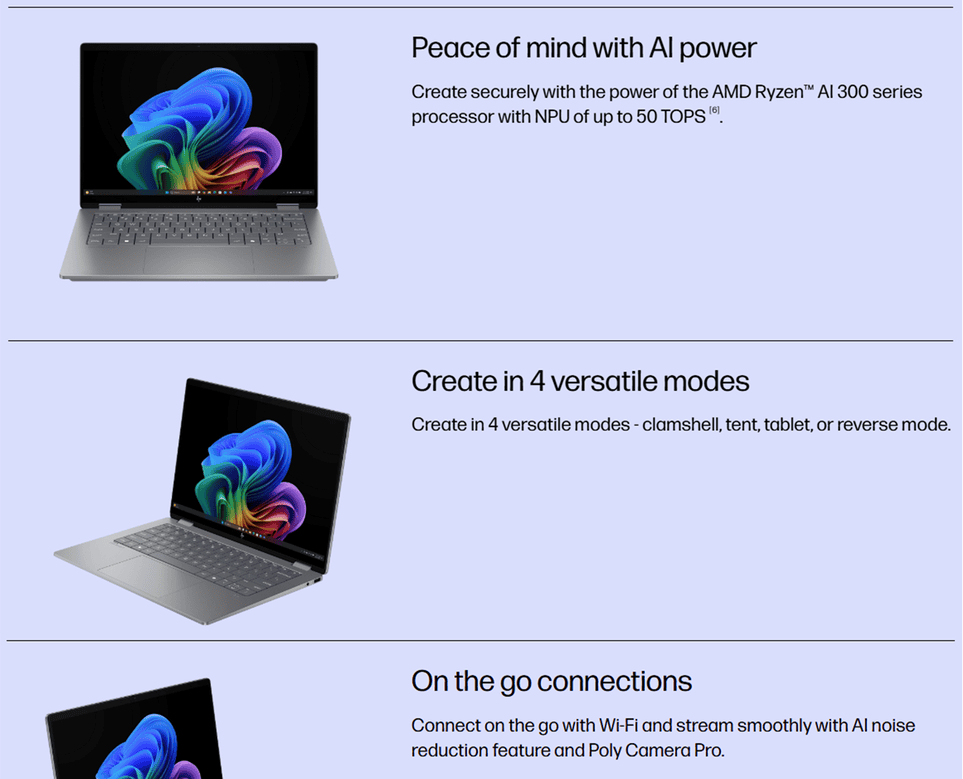 MediaTek Wi-Fi 6E MT7922 (2x2) and Bluetooth® 5.3 wireless card Modern Standby (Connected);HP Extended Range Wireless LAN;HP Dynamic Range Technology