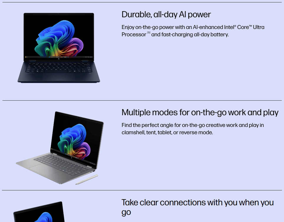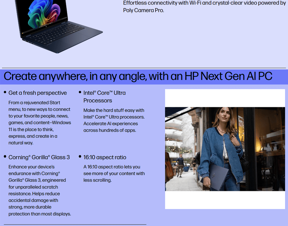 Intel® Wi-Fi 6E AX211 (2x2) and Bluetooth® 5.3 wireless card (Modern Standby (Connected);HP Extended Range Wireless LAN;HP Dynamic Range Technology)