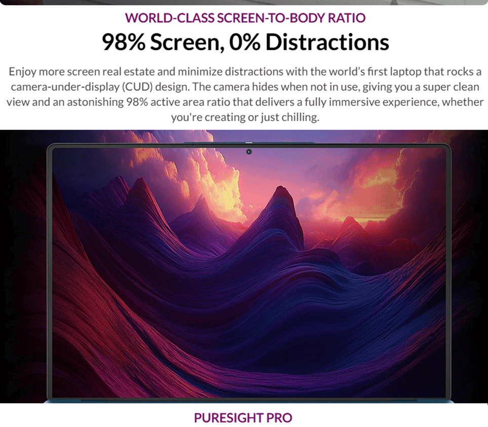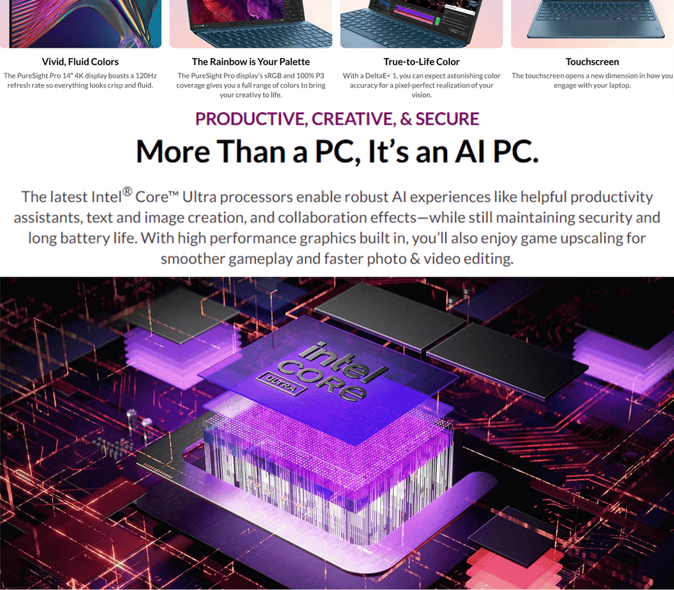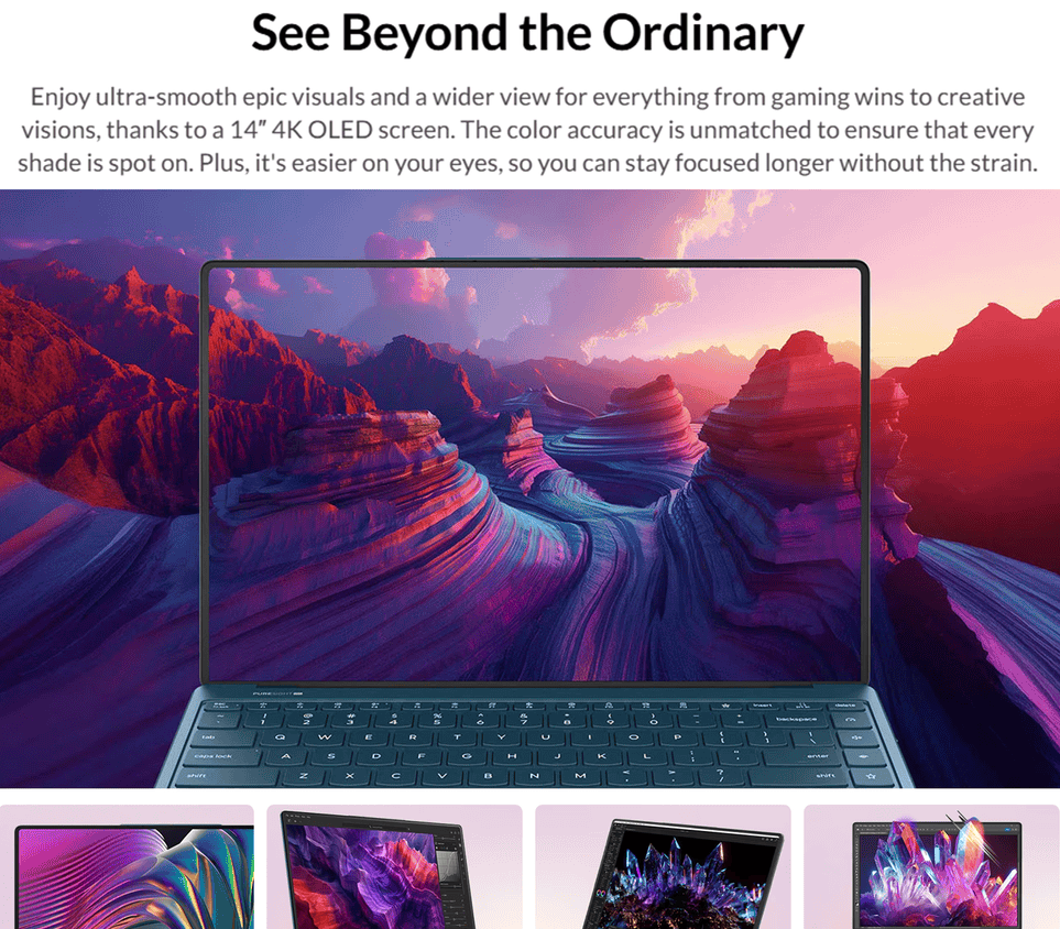 • 14" 4K WQUXGA (3840x2400) OLED 750nits (peak) / 600nits (typical) Glossy, 120Hz, 100% DCI-P3, TouchScreen