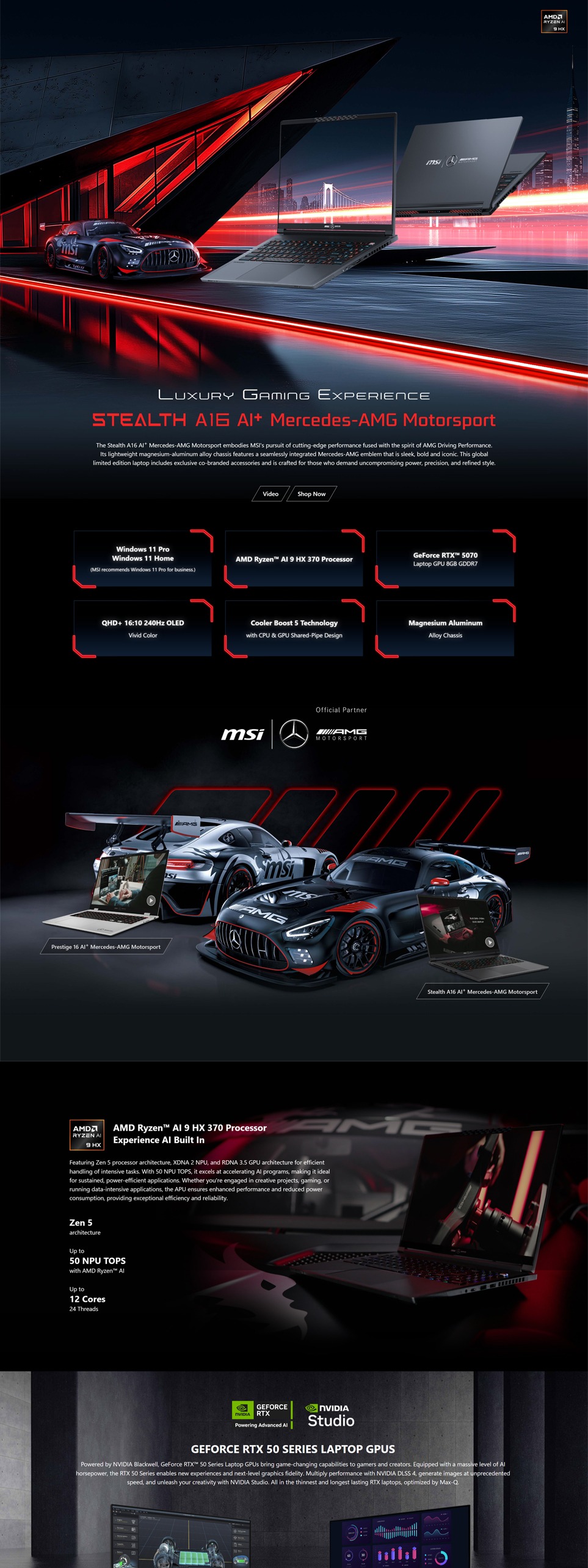 MSI Stealth A16 MercedesAMG AI+ A3XWGG-037 16'' QHD+ Gaming Laptop ( Ryzen AI 9 HX 370, 32GB, 2TB SSD, RTX5070 8GB, W11 )0