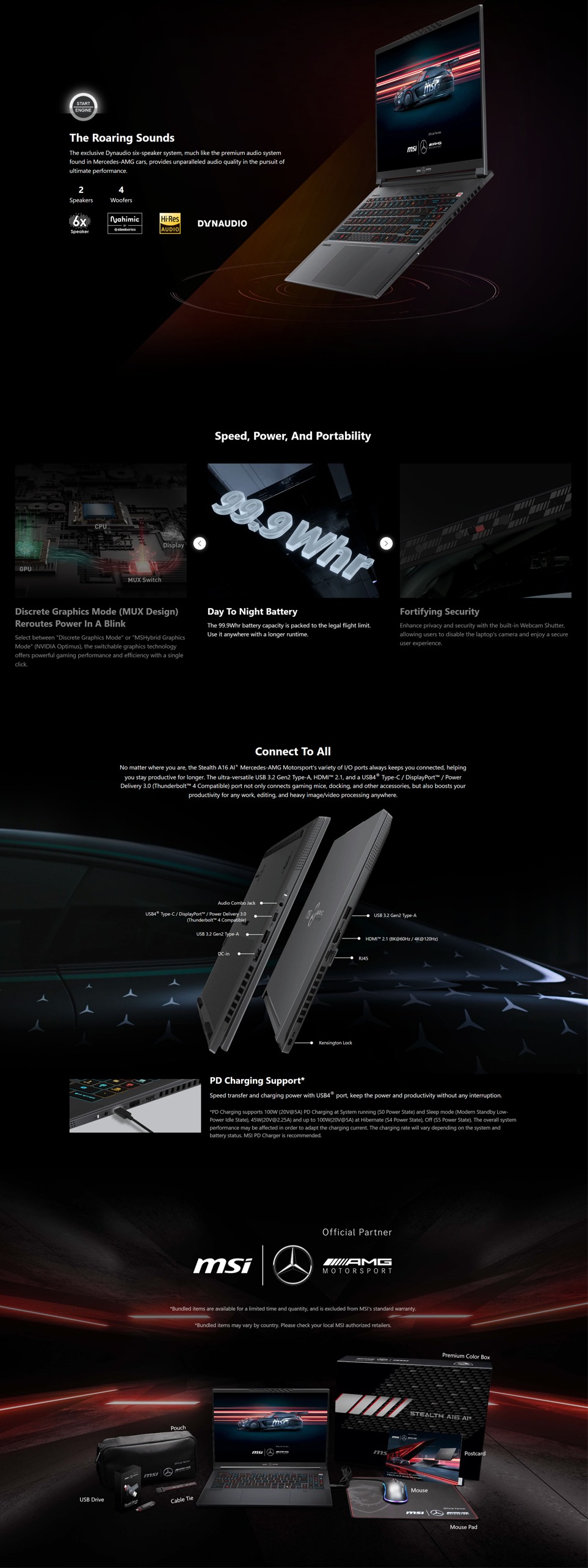 • MSI Stealth A16 MercedesAMG AI+ A3XWGG-037 16'' QHD+ Gaming Laptop ( Ryzen AI 9 HX 370, 32GB, 2TB SSD, RTX5070 8GB, W11 )3