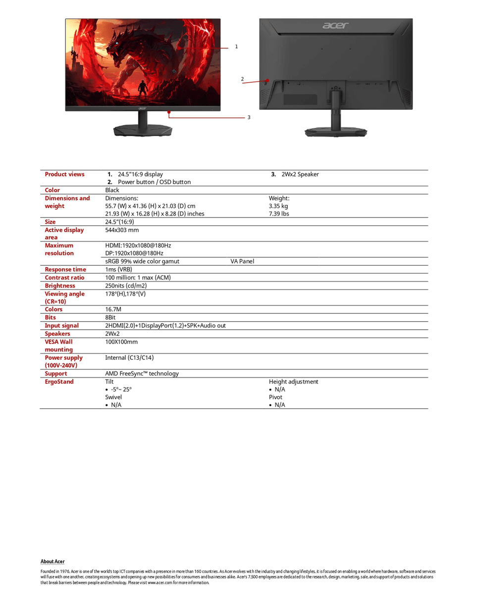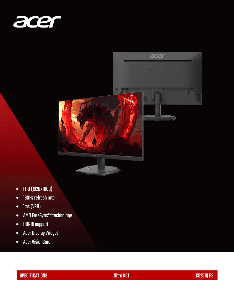 Acer Nitro KG251Q P3 24.5" FHD 180Hz Flat Gaming Monitor ( DP, HDMI, 3 Yrs Wrty )