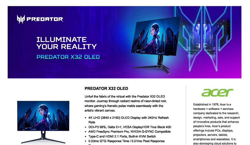 • Acer Predator X32 X3 31.5'' 4K UHD OLED 240Hz Gaming Monitor ( Speaker, HDMI, DP, USB, 3 Yrs Wrty )0