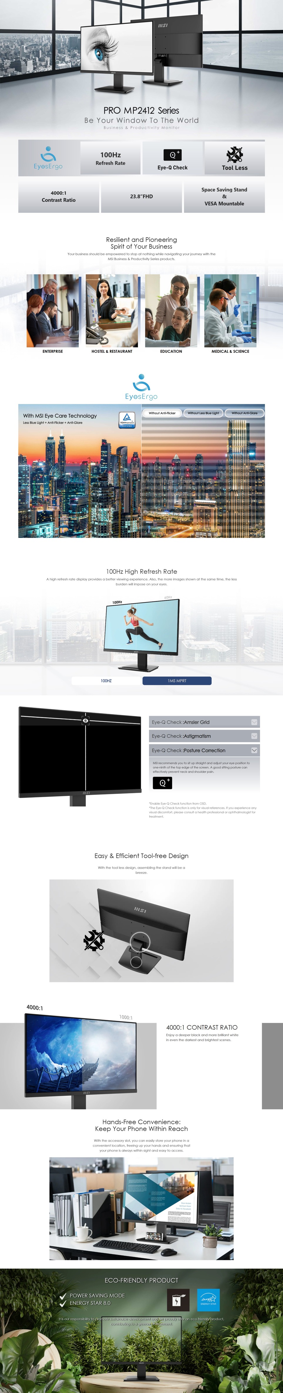 MSI Pro MP2412 23.8" FHD 100Hz Flat Monitor Black ( HDMI, DisplayPort, 3Yrs Warranty )