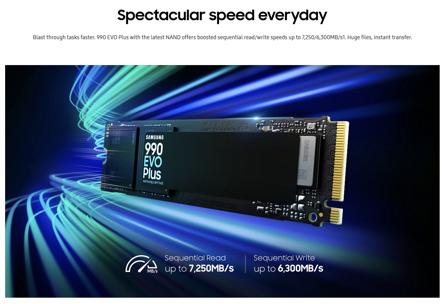 Up to 7,150 MB/s read speed, Up to 6,300 MB/s write speed (1TB)