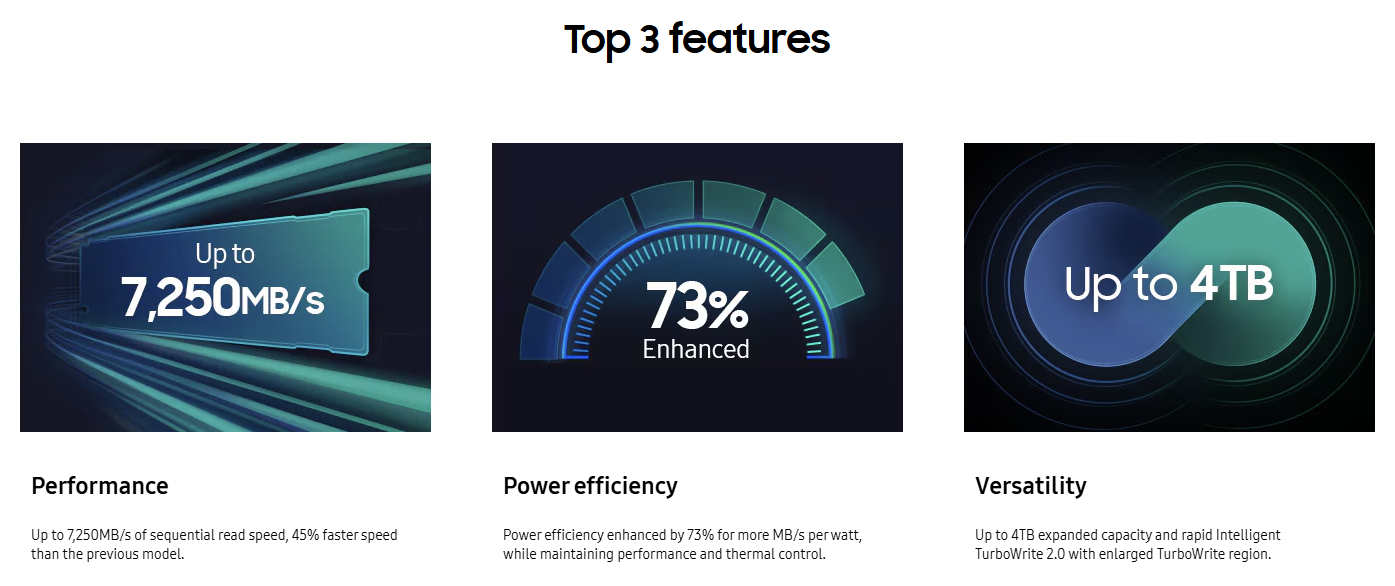 Up to 7,250 MB/s read speed, Up to 6,300 MB/s write speed (2TB / 4TB)